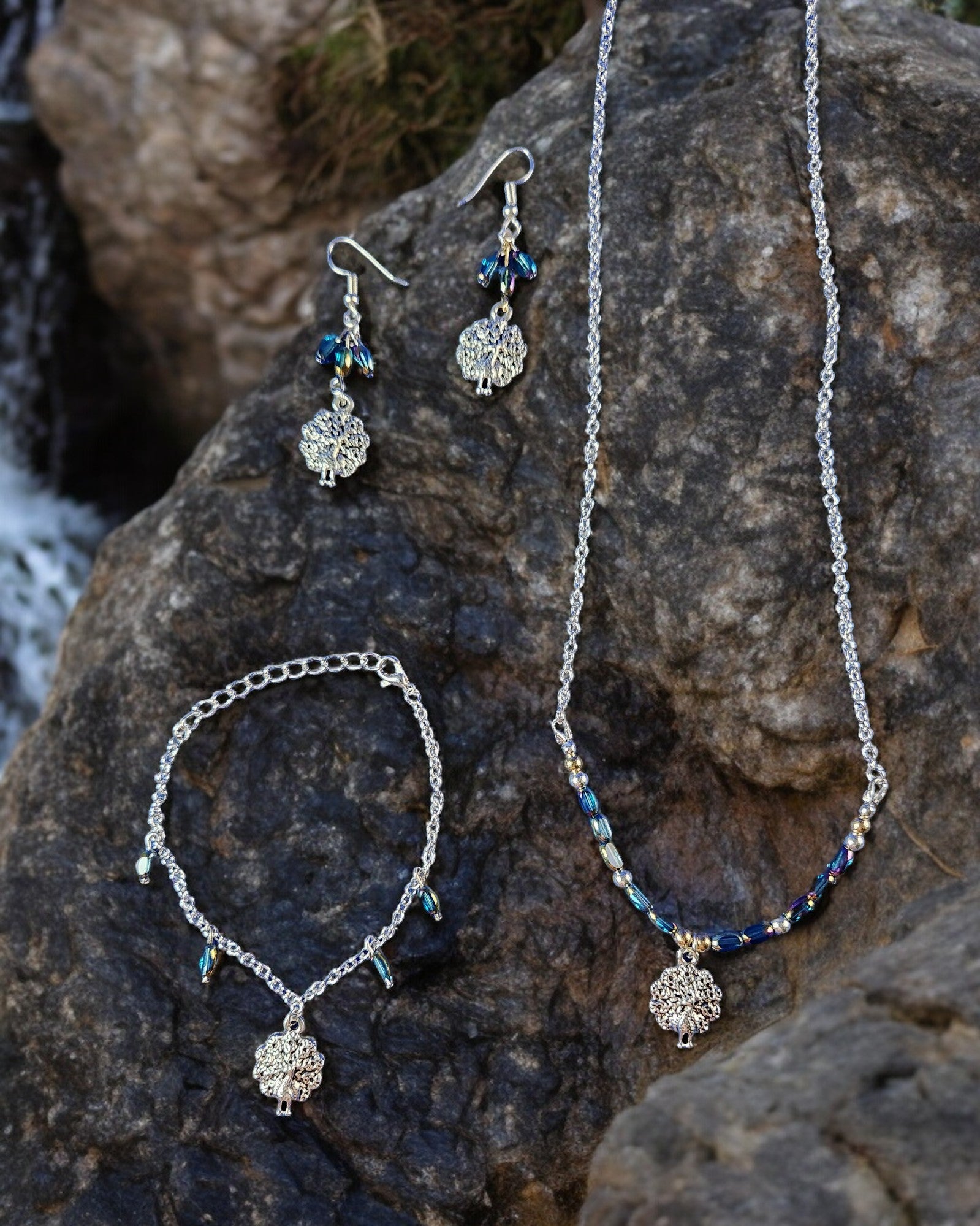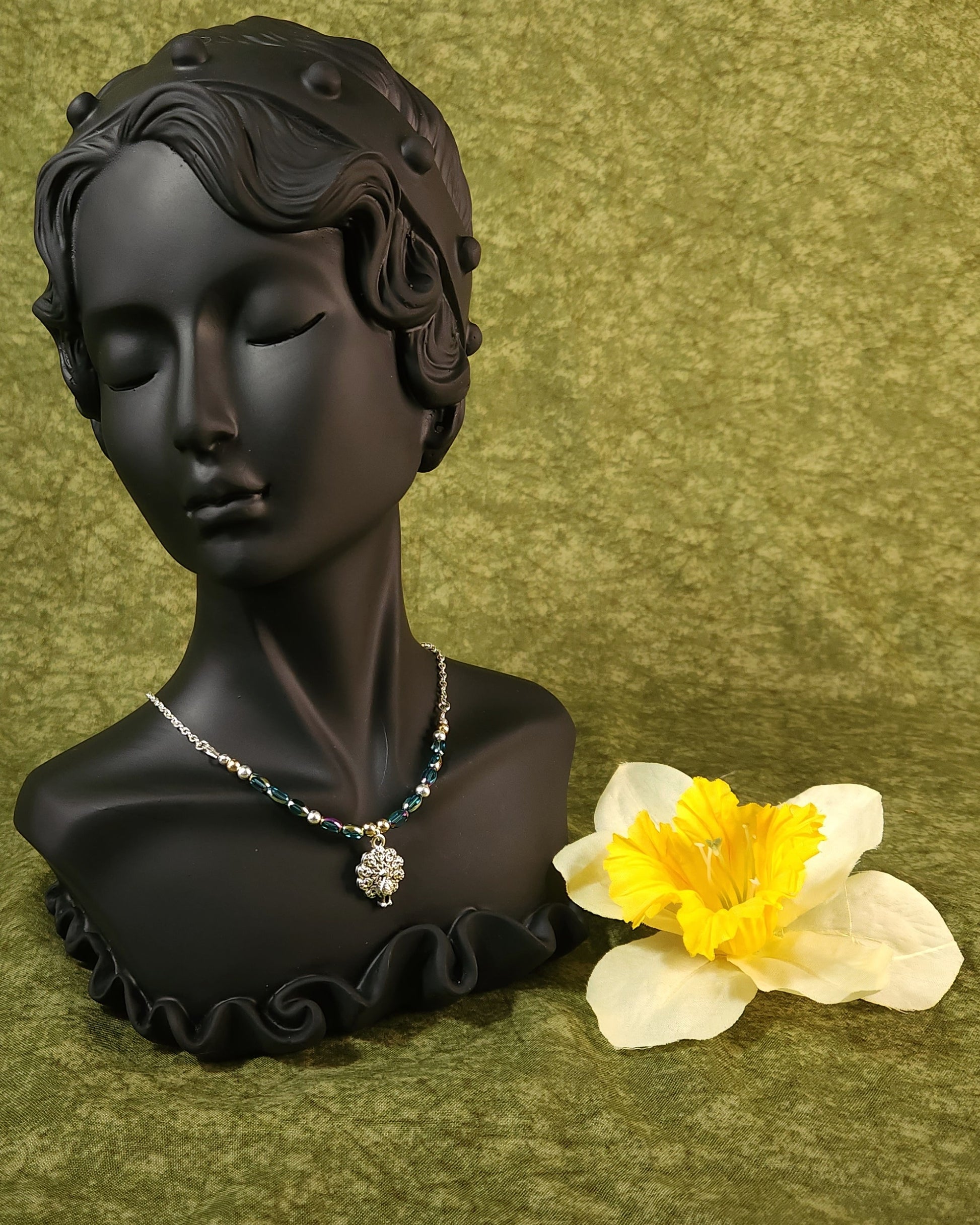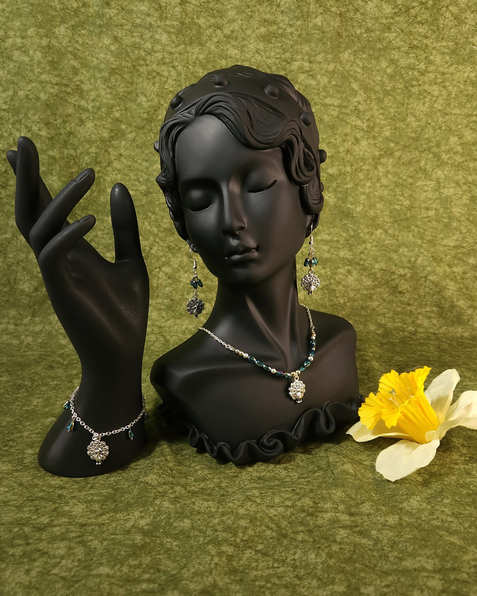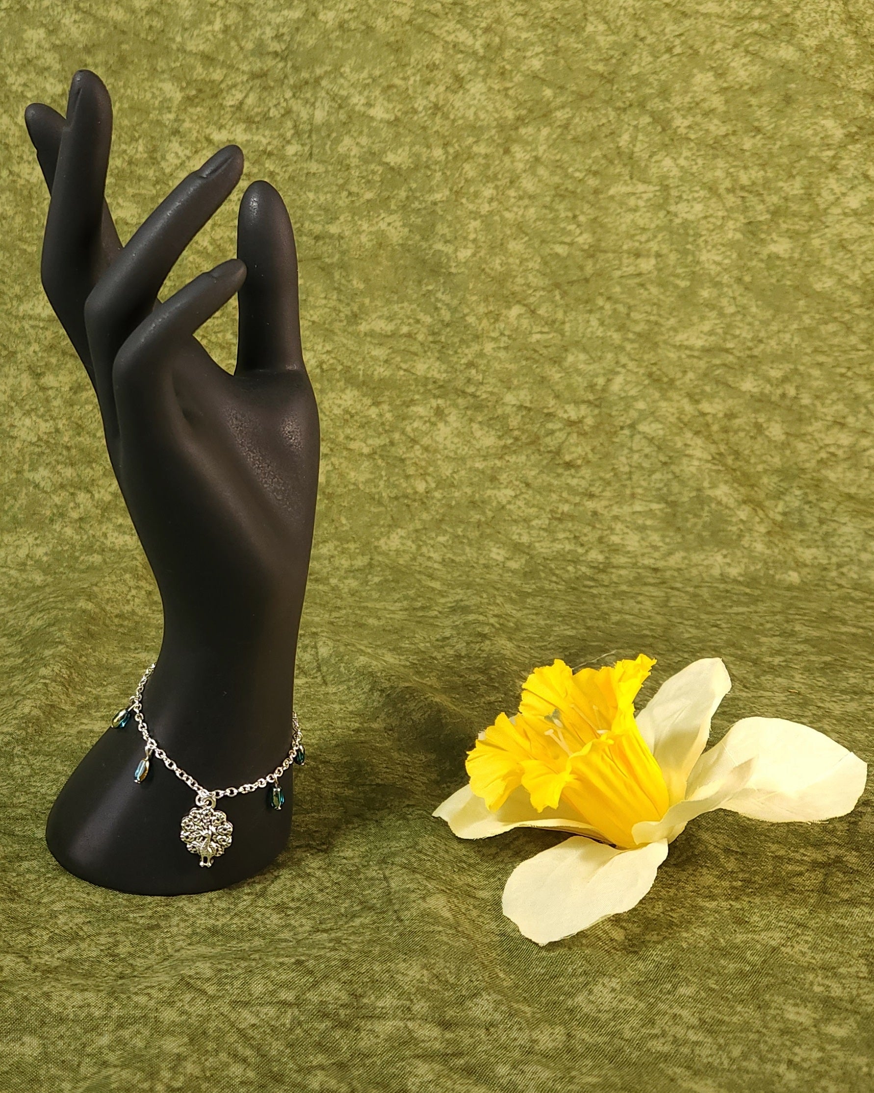 Peacocks are symbols of elegance and beauty with their iridescent blue and green plumage. Like the plumage, the beads spread out above the silver peacock.